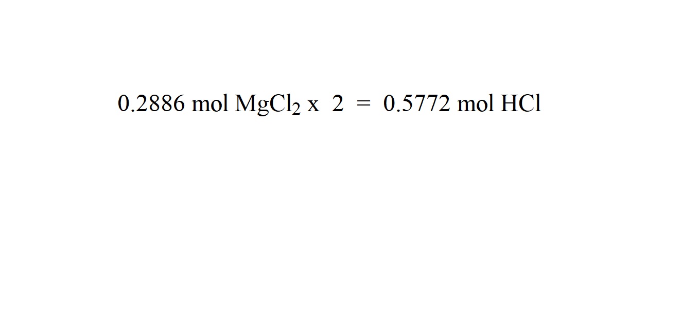 The mole ratio of hydrochloric acid to magnesium chloride is 2 moles to 1 mole. Therefore in order to work out how many moles of hydrochloric acid were involved as a reactant, we must multiply the amount in moles of magnesium chloride by 2.