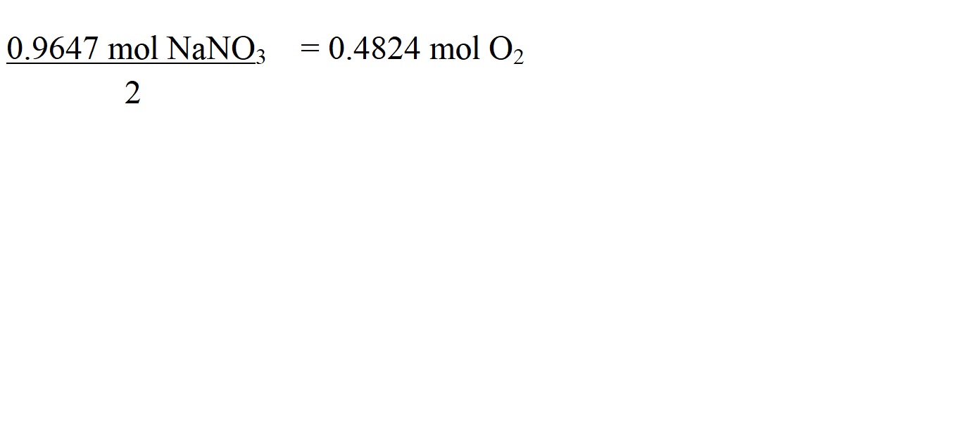 The mole ratio of sodium nitrate to oxygen is 2 moles to 1 mole. This means that to work out the amount in moles of oxygen, we must divide the amount in moles of sodium nitrate by 2.