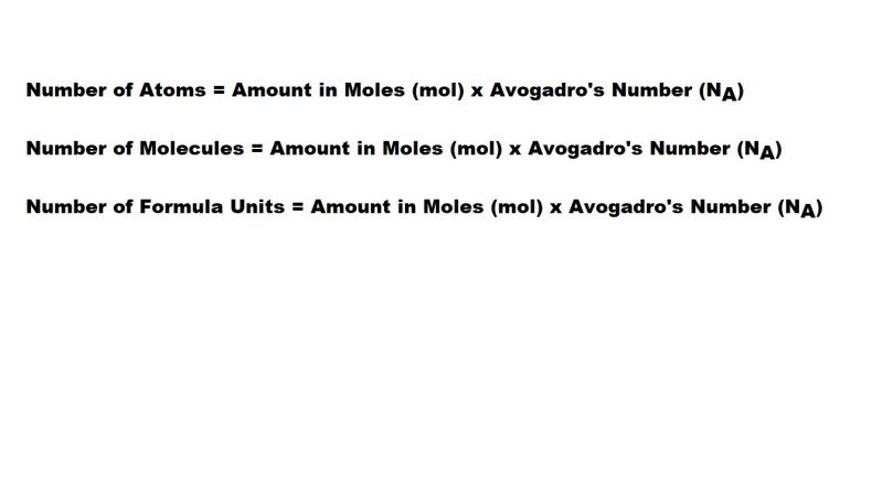The number of particles involved is calculated by multiplying the amount in moles of the chemical substance by Avogadro’s number as illustrated by the formulas below.