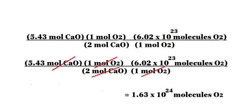 Step 3: Organise the calculation to include the given amount in moles of calcium oxide followed by two conversion factors: one that shows the mole ratio between oxygen and calcium oxide and one that consists of Avogadro’s number with the unit of molecules of oxygen and the equivalent value of 1 mole of oxygen.