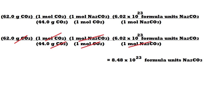 The correct placement of the above variables allows us to cancel out the units we don’t want for our final answer and only leave the unit we want which is formula units of sodium carbonate.